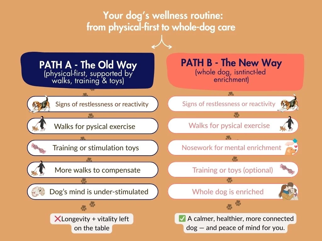 Path 1: Keep meaning to “try something someday” — while stress, boredom, and missed moments slowly pile up. Weeks slip by, your pup’s mind stays under-stimulated, and you wonder if you’re really doing all you can for their health and happiness.